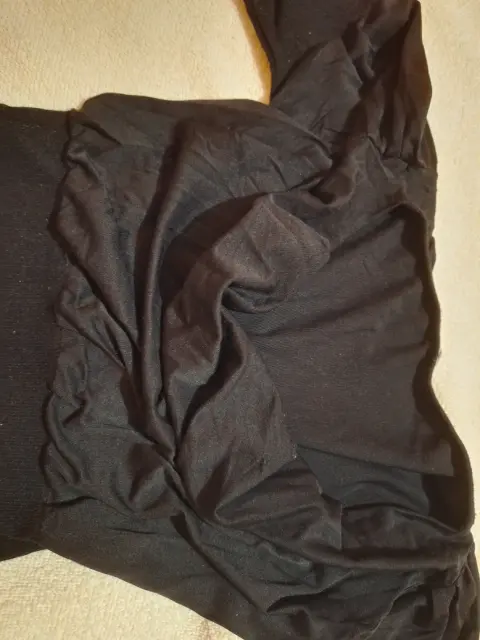 Hermosa y sexy blusa de color negro. En las mangas y en el abdomen tiene fajita que te ayuda a que te quede más pegadita y te amolde super bien a tu cuerpo. De enfrente, en el cuello tiene una linda caída que lo hace lucir muy sexy el escote. Puede quedar para una talla chica o mediana, dependiendo que tan ajustada la quieras