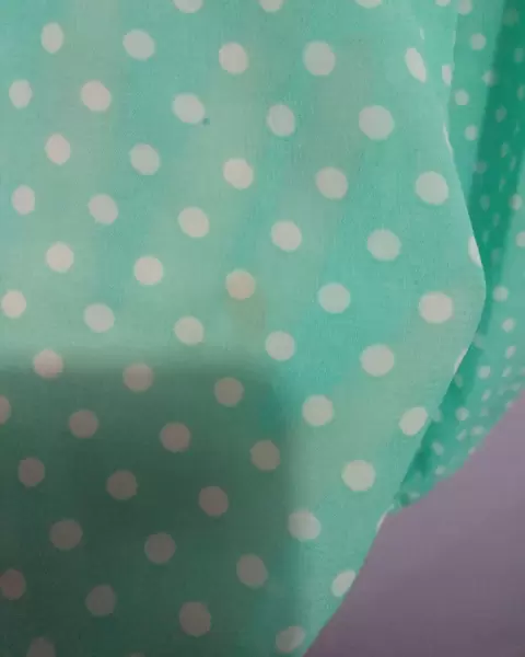 Blusa transparente verde. Blusa verde con bolitas blancas.Tiene una mancha azul en la aparte de atrásResorte en cuello, cintura y brazos