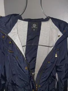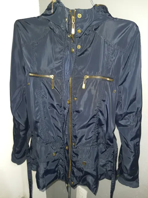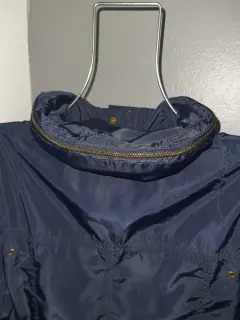 Hermosa chamarra azul marina con detalles dorados en botones y cierre, tiene gorra y cinturón. Ligera pero abrigadora, esta en perfecto estado solo los botones estan un poco desgastados lo cual no afecta en nada su estética. Se ve moderna y elegante. O deportiva dependiendo con que la combines.