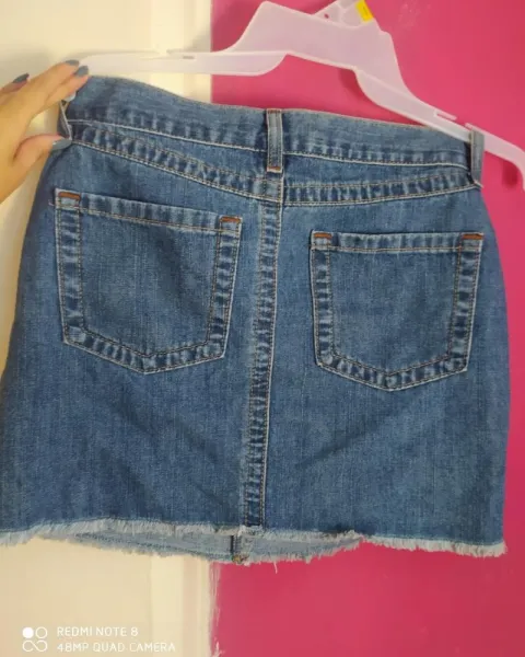 Falda de mezclilla corta, muy bonita, el único detalle son dos pinzas de cada lado, fácil de quitar con medidas:Cintura: 69 cmLargo: 32 cmCadera: 78 cm