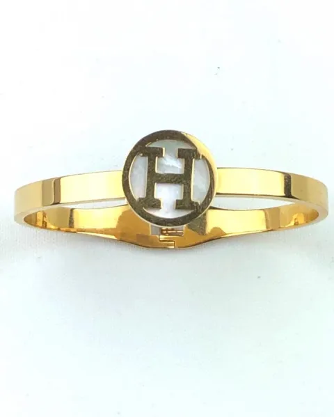 Pulsera Golden H. Pulsera Golden H, de acero inoxidable con la letra H incrustada en fondo nácar, luce muy linda.