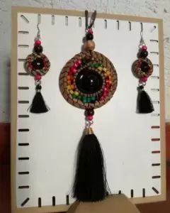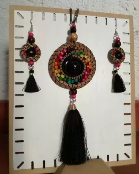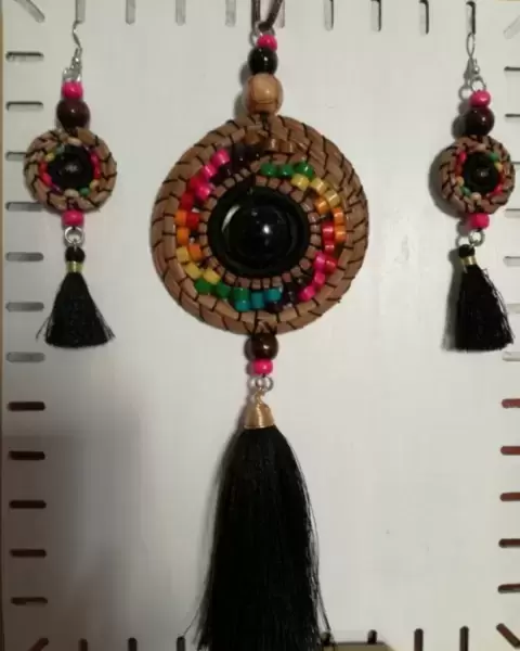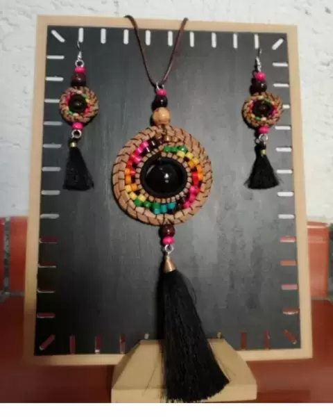 Set de Collar y Aretes Artesanal de Colores. Piezas originales, modernas y de vanguardia empleando la técnica del bordado de fibras vegetales (ocoxal). 100% Artesanales de hoja de pino, únicos, innovadores y que inspiran el cuidado del medio ambiente. Consumo con propósito, consumo responsablePRECIO FIJO