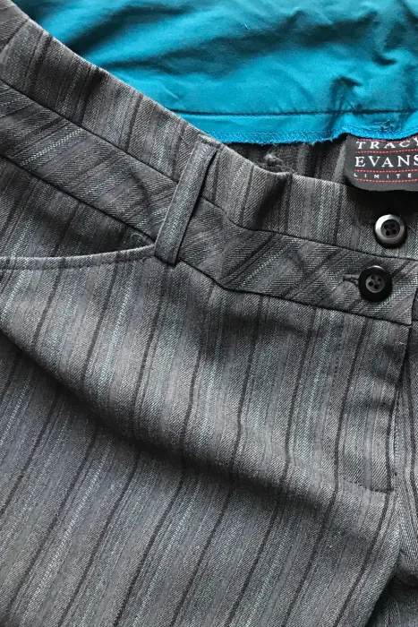 Pantalón vestir Tracy Evans talla 6 pantalón corte recto en las piernas / pretina ancha / color: rayado gris, negro, verde