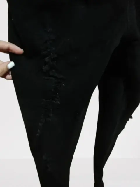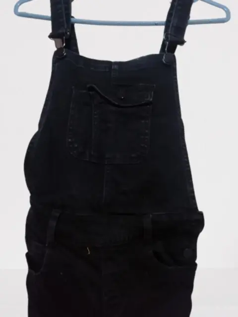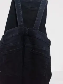 Peto/jumpsuit mezclilla negro. Jumpsuit de mezclilla con tiras ajustables con bolsillo delantero y a los lados, con desgarro mezclilla en piernas.