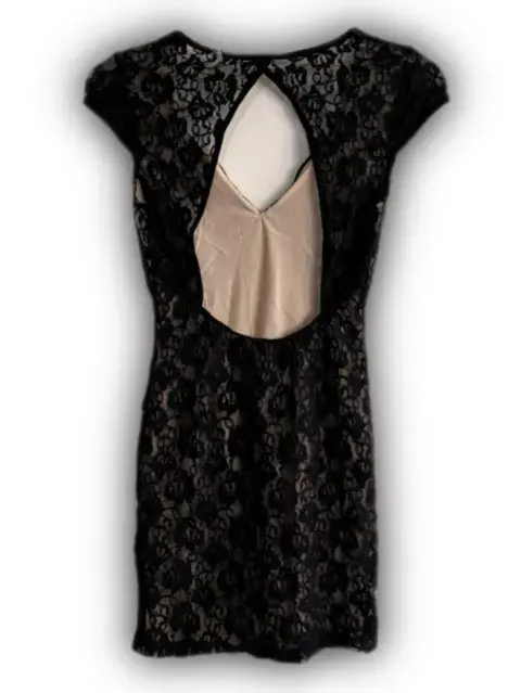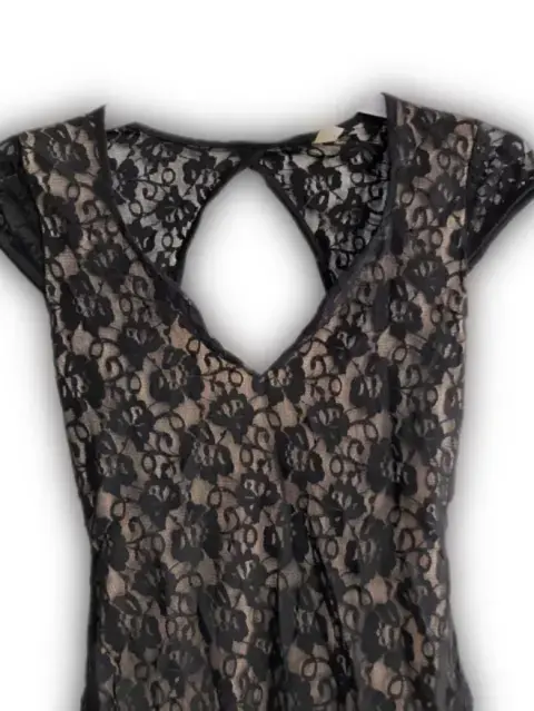 Vestido que encaje negro. Vestido de encaje negro con fondo baige, escote pronunciado manga semi corta talla mediana.•Precio a tratar• 😊