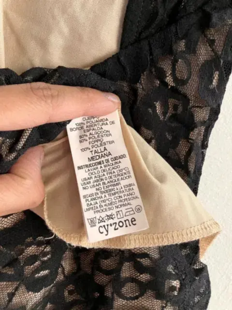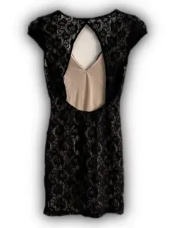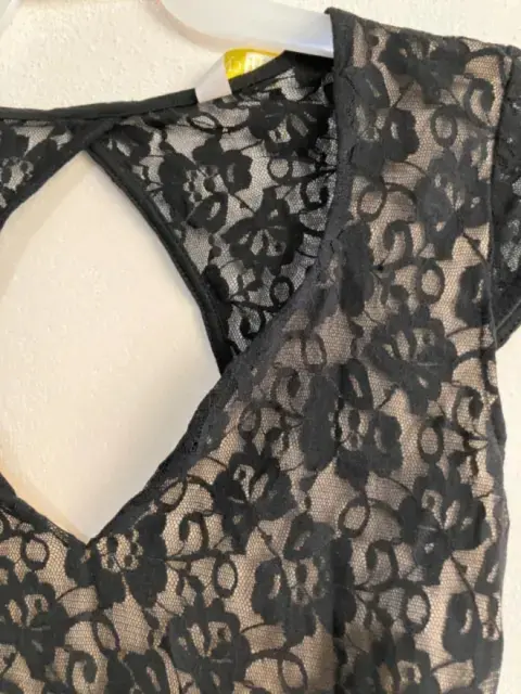 Vestido de encaje negro con fondo baige, escote pronunciado manga semi corta talla mediana.•Precio a tratar• 😊