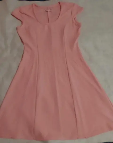 Hermoso vestido color rosa claro, con manga mini, de cuello redondo, tiene bastante vuelo, la tela estira. Apesar de ser unitalla queda bien para una M. Se vende sin cinturón. El corte del vestido hace ver buena figura