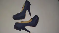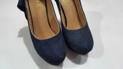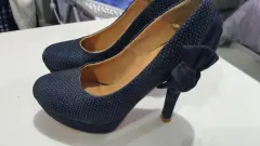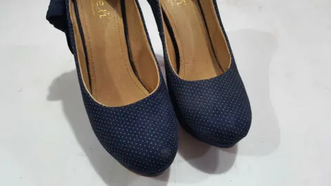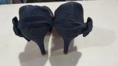 Hermosas zapatillas azul marino con detalles de puntotos y moños en la parte trasera, miden 12 cm de altura. Tienen detalles de uso pero no afecta su estética que se encuentra en perfecto estado.