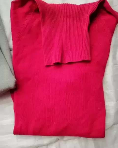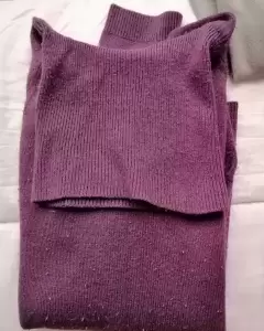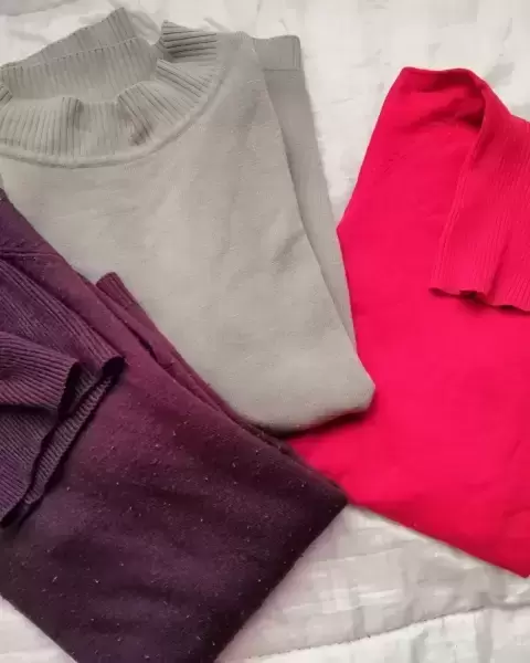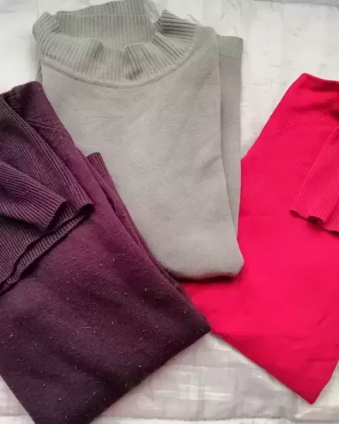 3 suéteres en buen estado uno rosa tiene una jaladita nada mas al frente es marca lob, suéter gris una manchita azul en la manga y el morado en buenas condiciones