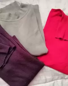 3 suéteres varios colores. 3 suéteres en buen estado uno rosa tiene una jaladita nada mas al frente es marca lob, suéter gris una manchita azul en la manga y el morado en buenas condiciones