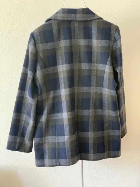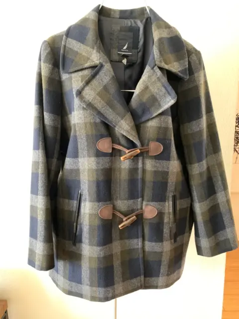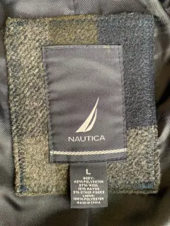 Abrigo a cuadros Náutica (L). Abrigo a cuadros Gris con Azul MarinoMarca: NáuticaAl frente tiene dos broches cafés y un par de bolsas laterales.En el interior tiene forro liso azul marino.Composición exterior: 45% poliester, 37% lana, 15% rayon y 3% otros materiales.Talla: XLMedidas:-De hombro a hombro: 42 cms-De sisa a sisa: 55 cms-De cintura: 51 cms.-Largo desde la nuca al filo: 80 cms.Escríbeme para cualquier duda!