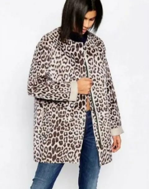 Abrigo Pepe Jeans, doble vista, de un lado es tornasol y del otro animal print, tiene como pelitos de este lado, y tiene bolsillos a los lados.