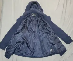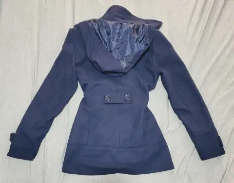 Abrigo azul marino con forro muy calientito, bolsas laterales y gorro.Queda a XS y S, no estira. Perfecto estado, muy poco uso.