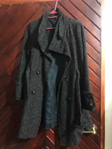 Lindisimo y muy abrigador, no tiene detalles y el cinturón hace que marque más la cintura. Queda desde mediana hasta máximo una talla grande.