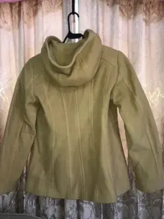 Abrigo corto confeccionado en lana con forro a tono, con gorro para mayor abrigo. Talla S, con botones al frente.