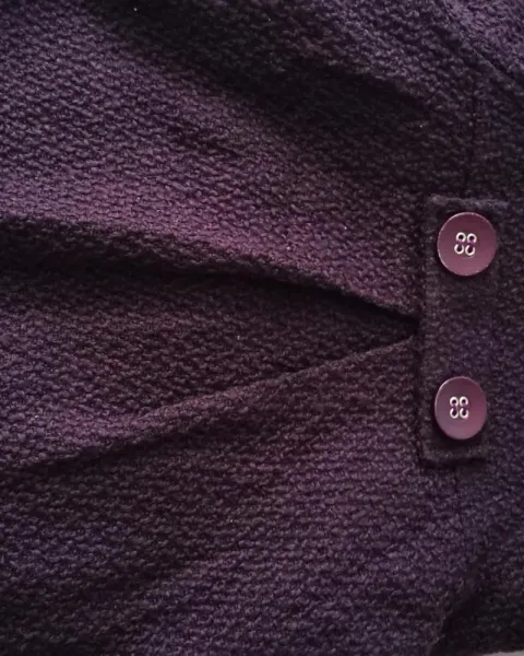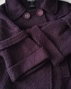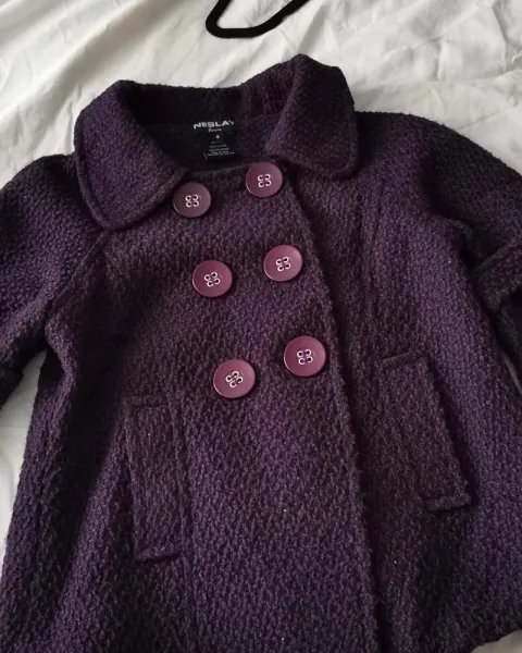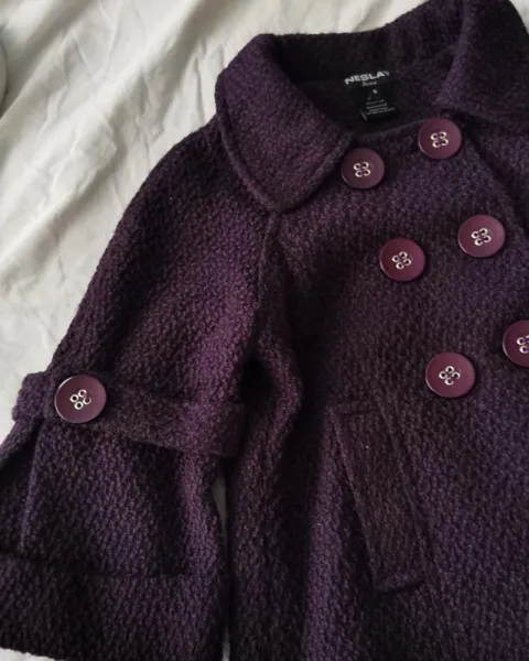 Abrigo corto color uva, trae 6 botones al frente es cruzado y tiene las mangas acampanadas65% es algodón35% poliester