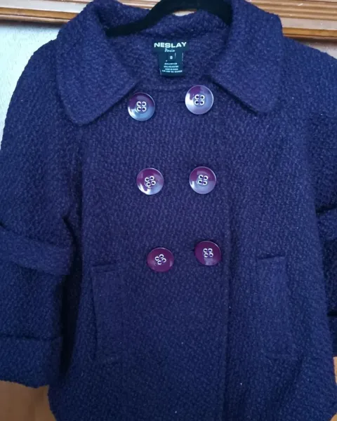 Abrigo corto color uva. Abrigo corto color uva, trae 6 botones al frente es cruzado y tiene las mangas acampanadas65% es algodón35% poliester