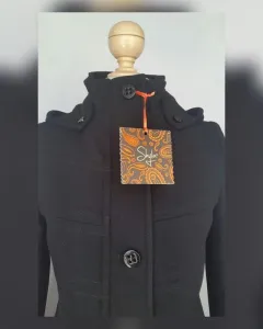 Abrigo corto en lana peinada color NEGRO ÉBANO, corte evasé, cuello Perkins, capucha DESMONTABLE p/botonadura, cierre p/cremallera oculta p/tapeta c/botonadura, 2 bolsos vivo c/tapeta y forro interior. Talla 32. Dimensiones cms: 38 hombro, 50 axila, 44 cintura, 59 zona baja, 69 largo, 61 largo manga. 80% lana, 20% poliamida. P/lavado en seco.***APROVECHA, ESTA MARCA YA NO COMERCIALIZA ABRIGOS CON ESTE PORCENTAJE DE LANA***ESTA PRENDA ESTA AVALADA CON EL SIMBOLO *WOOLMARK BLEND* QUE CONSTATA EL ALTO ESTANDAR DE CALIDAD DE ESTA PRENDA ELABORADA EN LANA***