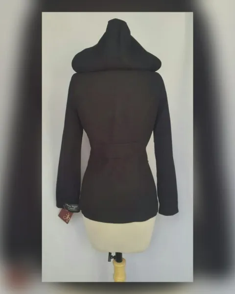 Abrigo Corto Lana Peinada Capucha. Abrigo corto en lana peinada color NEGRO ÉBANO, corte evasé, cuello Perkins, capucha DESMONTABLE p/botonadura, cierre p/cremallera oculta p/tapeta c/botonadura, 2 bolsos vivo c/tapeta y forro interior. Talla 32. Dimensiones cms: 38 hombro, 50 axila, 44 cintura, 59 zona baja, 69 largo, 61 largo manga. 80% lana, 20% poliamida. P/lavado en seco.***APROVECHA, ESTA MARCA YA NO COMERCIALIZA ABRIGOS CON ESTE PORCENTAJE DE LANA***ESTA PRENDA ESTA AVALADA CON EL SIMBOLO *WOOLMARK BLEND* QUE CONSTATA EL ALTO ESTANDAR DE CALIDAD DE ESTA PRENDA ELABORADA EN LANA***