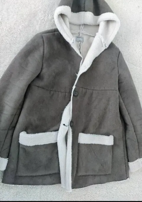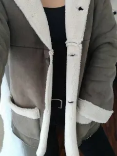 Abrigo de peluche, talla S y que a M, es largo y muy abrigador, sin detalles.