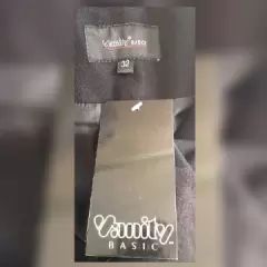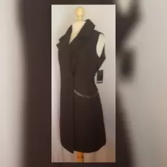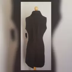 Abrigo estilo Chaleco corte Évase. Abrigo estilo chaleco corte évase color NEGRO ÉBANO, cuello clásico c/solapas muesca, manga sisa, cierre p/botonadura y snap cubiertos p/tapeta, 2 bolsos vivo frontales y forro interior. Talla 32. Dimensiones cms: 42 hombro, 56 axila, 50 cintura, 74 zona baja, 95 largo. 93% poliéster, 5% viscosa, 2% elastano. Para lavado en seco.