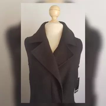 Abrigo estilo chaleco corte évase color NEGRO ÉBANO, cuello clásico c/solapas muesca, manga sisa, cierre p/botonadura y snap cubiertos p/tapeta, 2 bolsos vivo frontales y forro interior. Talla 32. Dimensiones cms: 42 hombro, 56 axila, 50 cintura, 74 zona baja, 95 largo. 93% poliéster, 5% viscosa, 2% elastano. Para lavado en seco.