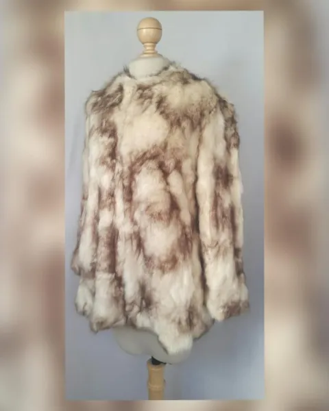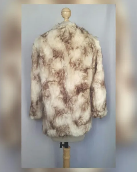 Abrigo Faux Fur efecto Pelo. Abrigo faux fur efecto pelo textura soft base tono MARFIL c/tonos CAFÉ MARMOLEADO, corte evasé, cuello redondo, cierre p/ganchillos, 2 bolsos vivo frontales y forro interior. Talla L. Dimensiones cms: 44 hombro, 53 axila, 67 zona baja, 72 largo, 57 largo manga. 60% acrílico, 23% modacrilica, 17% poliéster. P/lavado en seco.