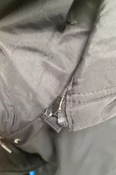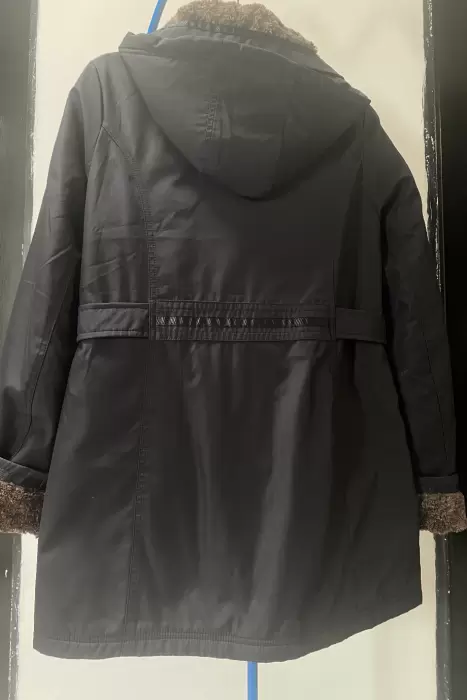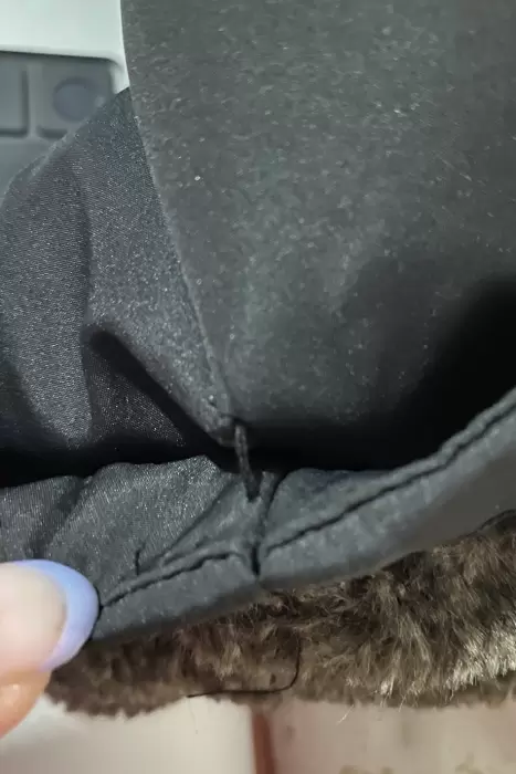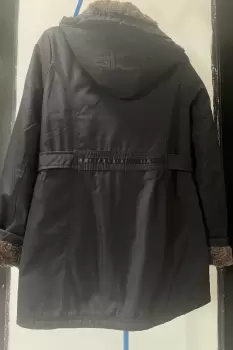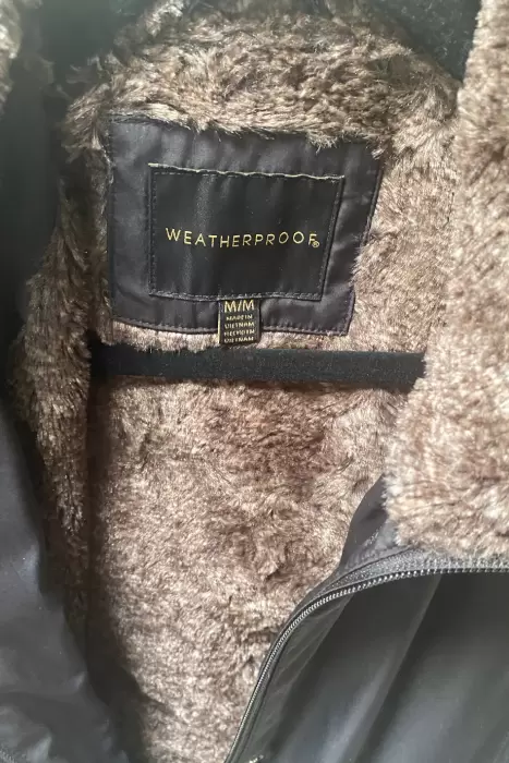 Abrigo Impermeable. Abrigo es negro con peluche en el interior, gorro y puños, El gorro es removible, tiene cierre y botón de clip, el abrigo jamás se uso pero le falta una pequeña puntada que sostiene al puño (anexo foto del puño que está bien, solo para dar idea de cómo debería verse) no afecta en lo absoluto a su funcionalidad y el puño aún sin la puntada se mantiene arriba. 100% poliéster