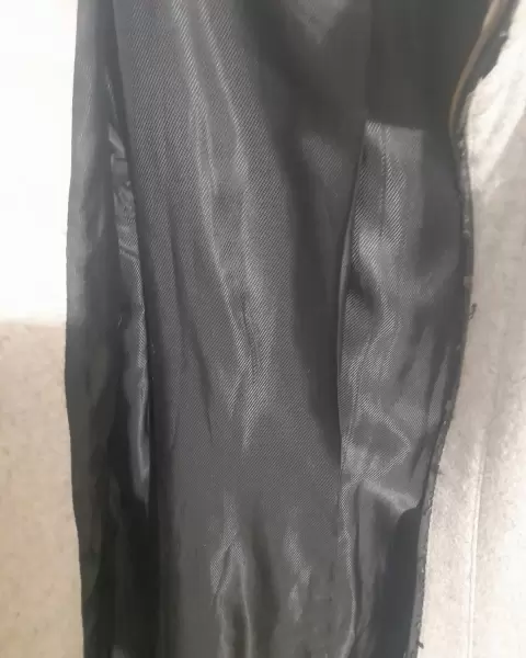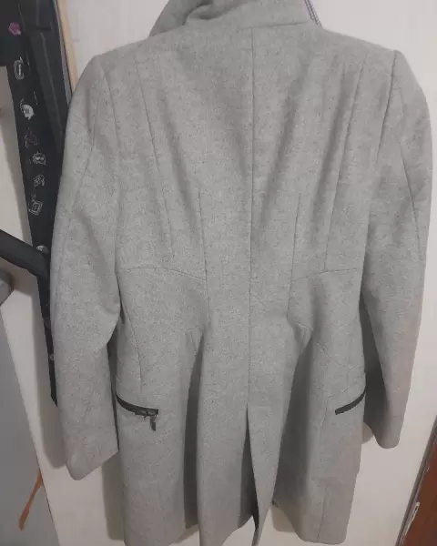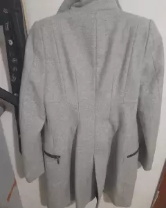 Hermoso abrigo lana en tono gris, forro negro, bolsas al frente, cierres dorados en buen estado, bies negro que cubre los cierres.Talla s.Medida de axila a axila 46Largo 86.