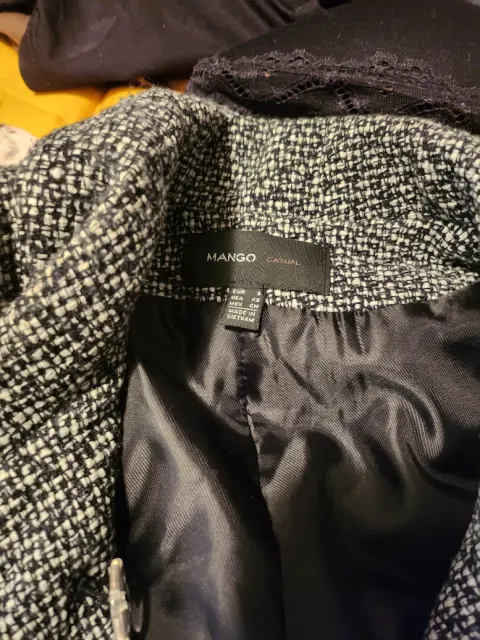 Abrigo casual tejido blanco con negro y mangas negras en talla chica marca mango y justo para esta temporada invernal