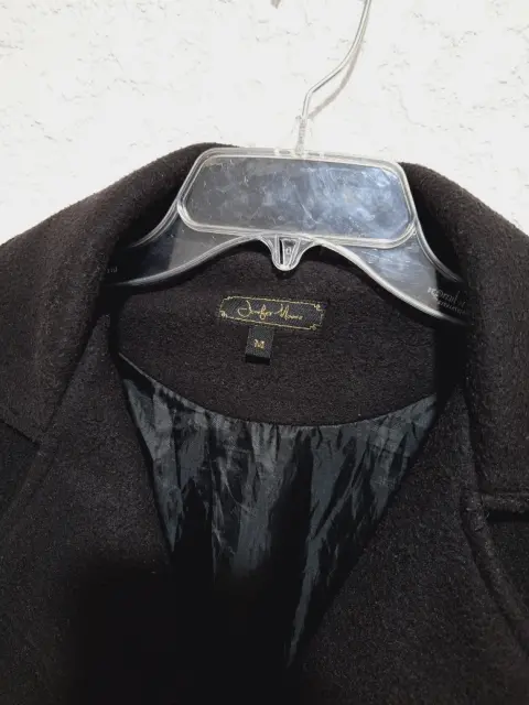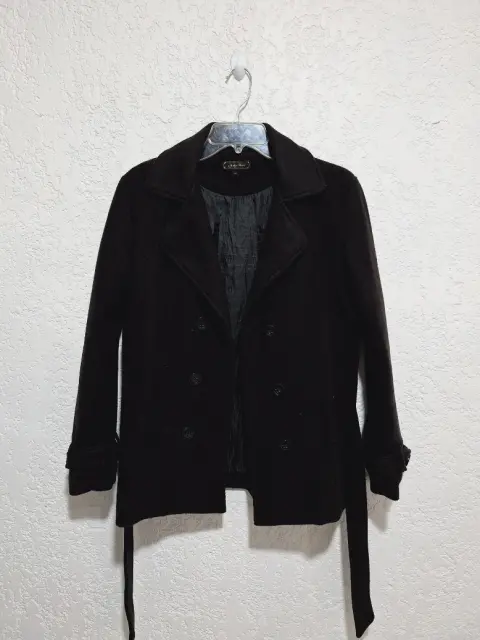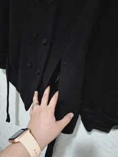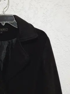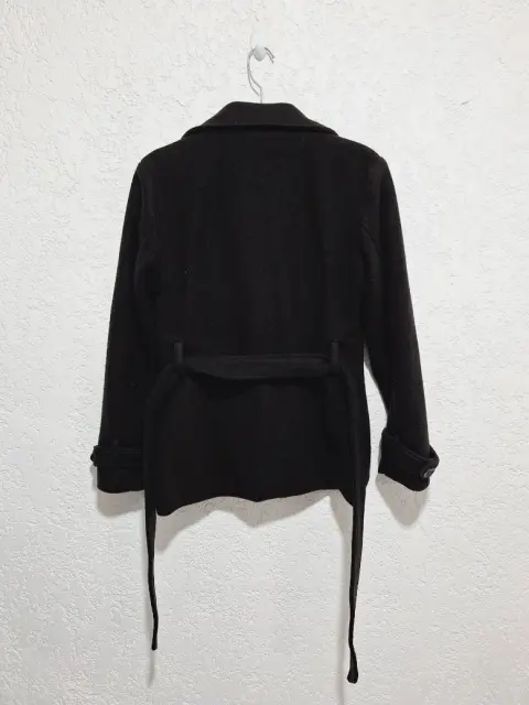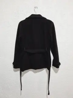 Abrigo color negro, tela tipo lana, tiene un cinto y bolsos en los laterales, tiene doble botón (uno es de vista y el otro abrocha).Medidas:Busto 96 cmCintura 92 cmLargo 66 cmHombros 42 cmLargo de manga 59 cm