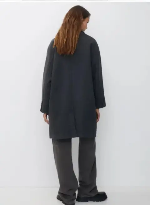 Abrigo gris de paño, tiene botones y bolsos al frente. La talla es chica pero como es over size también puede funcionar para una mediana.