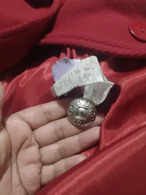 No trae los botones originales solo el repuesto, color vivo forro en buen estado parece un pequeño desgaste en el are del cuello en la parte de atrás. Talla 38