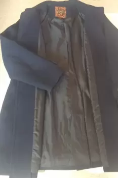 ABRIGO SHULA A LA RODILLA AZUL MARINO. Elegante abrigo en color azul marino, de la marca Shula, talla 34, 90% poliéster, 7% viscosa, 3% elasteno, forro 100% poliéster, muy cómodo y abrigador. Solo 3 puestas. Excelentes condiciones, sin detalles, se entrega como se ve en las fotos. Precio regular en tienda es de $ 1,500.00 lo vendo en $ 700.00