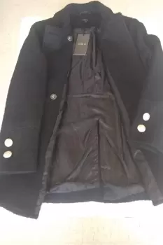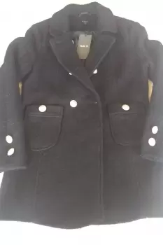 Elegante abrigo en color negro, de la marca Studio Si, talla G, viene reducido por lo que queda a personas talla 30 o 32, 62% poliéster, 38% lana, cruzado al frente con botones y bolsas al frente, muy calientito. Es nuevo. Precio regular en tienda es de $ 899.00 lo estoy rematando en $ 550.00