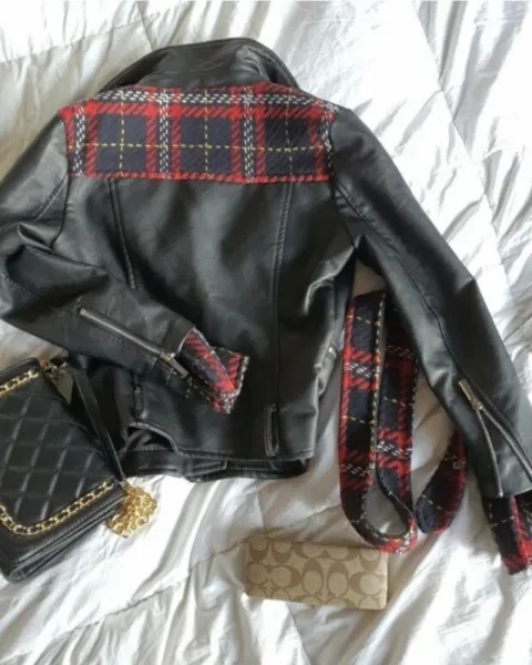 TODAVIA HUELE A NUEVO Chamarra de vinipiel negra obtenla con descuento del precio real, tiene detalles de lana roja cuadriculada y metales color plata, mangas con cierres y tiene bolsos, incluye cinturon que se puede poner y quitar.