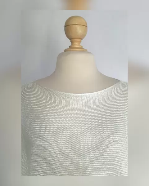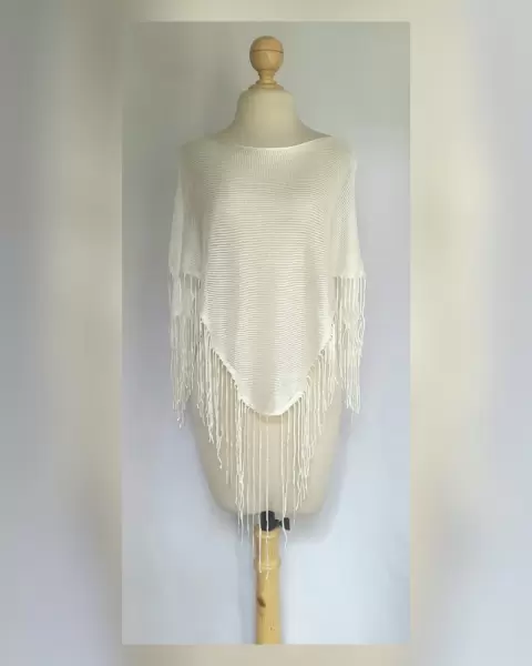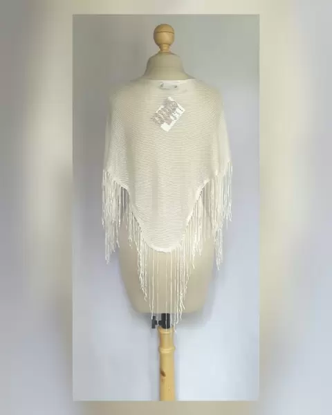 Capa ensamble en tejido de punto en tono BLANCO PERLADO, cuello barco y aplique de barbas. UNITALLA. Dimensiones cms: 31.5 cuello, 108 ancho, 47 largo. 100% viscosa. Para lavado en casa.***HECHO EN ITALIA***