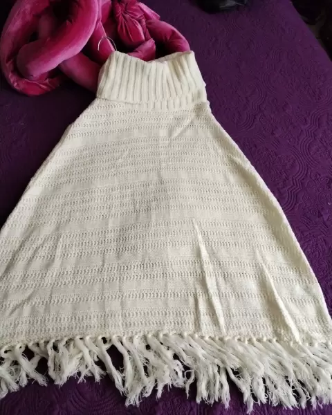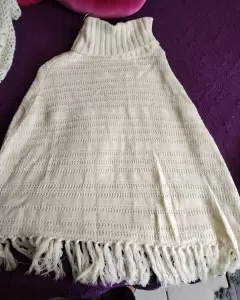 Capa tejida color hueso. Capa color hueso tejido cerrado, con cuello de tortuga, corte recto con flecos, textura ligera
