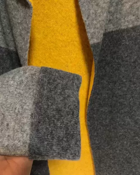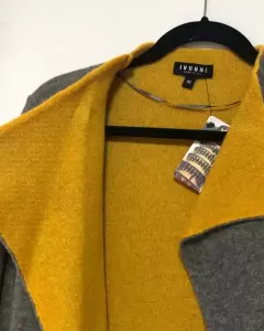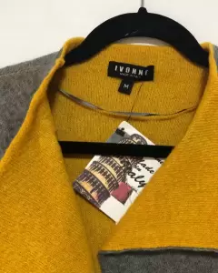 Cárdigan minimal bicolor Gris-MostazaLa etiqueta dice talla M66% lana, 29% poliamida, 4% otras fibras, 1% elastanoCon solapa
