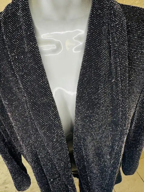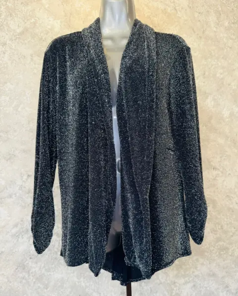 Cardigan o ensamble plateado con cola de pato en la parte de atrás talla mediana, mangas drapeadas y una caída súper bella. Ideal para estas fiestas decembrinas 🎄Su tela es delgadita, no es criada es meramente para elevar tu look.Tiene algunos hilitos sueltos ya que ese tiepo de tela es delicada.