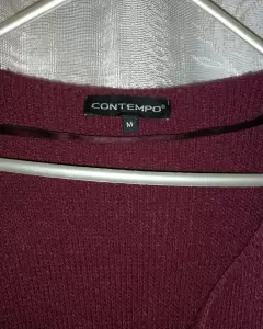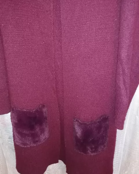 Cardigan vino talla M. Esta en buen estado, es calientita y suave, tiene bolsa de peluche y en talla al cuerpo, te invito a visitar mi closets siempre hay algo para ti.