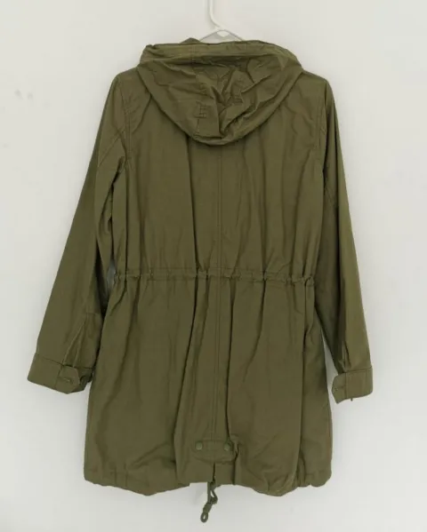 Casadora de tela tipo loneta color olivo. Cuello alto con capucha. Los puños de las mangas tienen 2 botones para ajustar. Siper cubierto con solapa con botones. Jareta con cintas para ajustar en la capucha, cintura y abajo. Bolsillos de jareta con solapa al frente. Talla S.