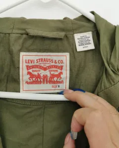 Casadora con capucha Levi's. Casadora de tela tipo loneta color olivo. Cuello alto con capucha. Los puños de las mangas tienen 2 botones para ajustar. Siper cubierto con solapa con botones. Jareta con cintas para ajustar en la capucha, cintura y abajo. Bolsillos de jareta con solapa al frente. Talla S.
