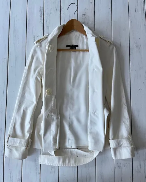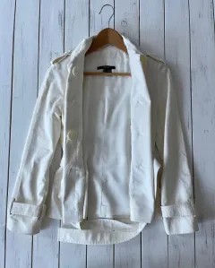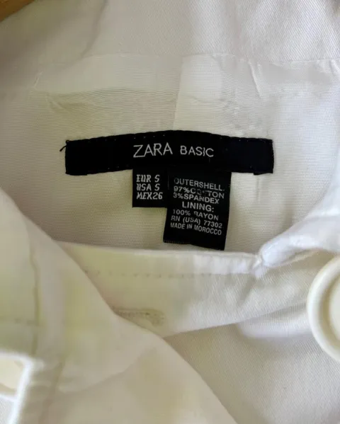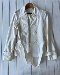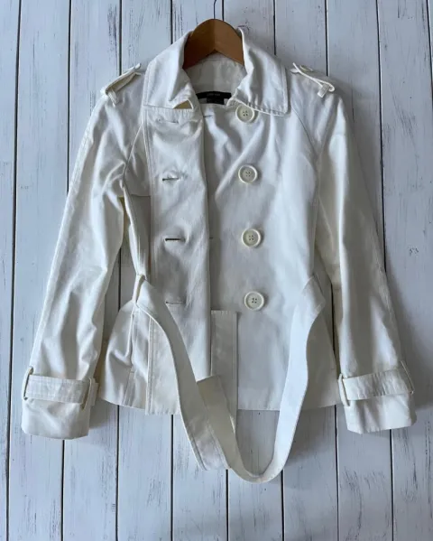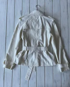 Cazadora beige Zara. Talla: SEl abrigo es beige, tiene botones por dentro, bolsillos laterales externos, cinto para ajustar, la tela es gabardina suave, no estira, 97% algodón y 3% spandex. Viene totalmente forrado por dentro y el forro es 100% rayón.Medidas: 38 cm de hombros aproximadamente, 44 cm de axila y 60 cm de largo.Para que llegue listo para usarse, una vez hecha la compra se manda a tintorería.