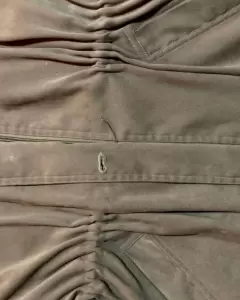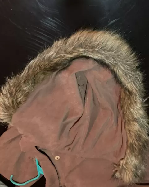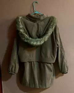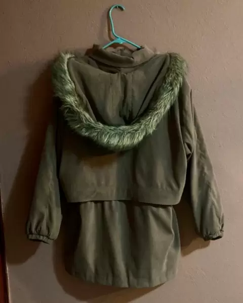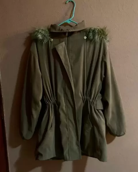 Cazadora color camel con gorro de la misma tela y peluche de complemento. Con jareta al interior para entallar la figura, resorte en los puños forro en buen estado, le faltan los tres botones al frente