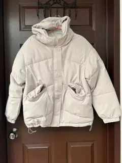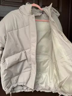Chamarra acolchanada tipo en color entre beige y gris, talla L, marca T&W, en la parte de abajo se puede ajustar