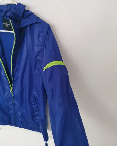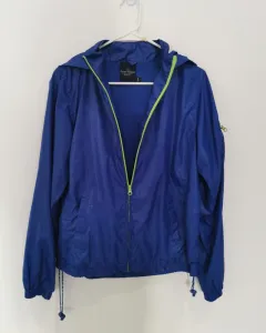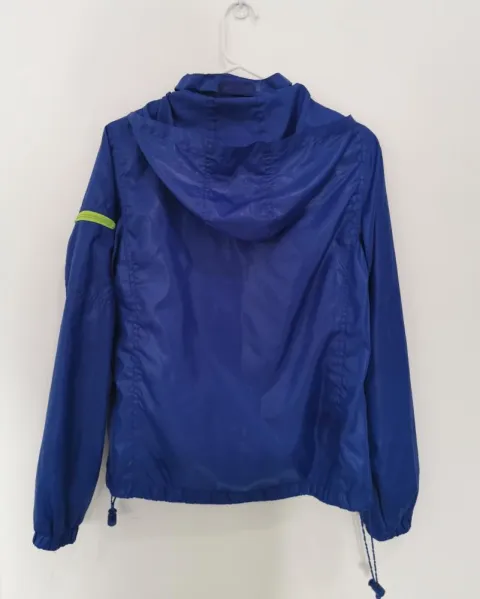Chamarra de tela impermeable color azul eléctrico. Siper en el pecho y manga color verde fosfo. Jareta en la cintura para ajustar. Cuenta con capucha que se puede ocultar en el cuello de la chamarra. Elástico en los puños de las mangas. Talla S.