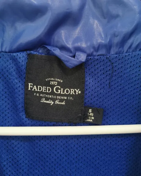Chamarra impermeable Faded Glory. Chamarra de tela impermeable color azul eléctrico. Siper en el pecho y manga color verde fosfo. Jareta en la cintura para ajustar. Cuenta con capucha que se puede ocultar en el cuello de la chamarra. Elástico en los puños de las mangas. Talla S.