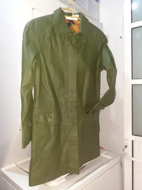 Chamarra larga de piel color verde 💚. Chamarra de piel larga, de uso sin ningún detalle, en buenas condiciones, talla M