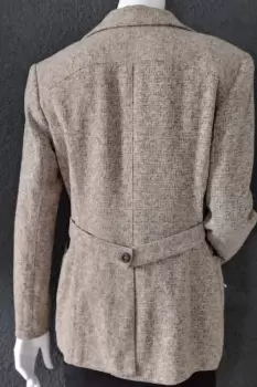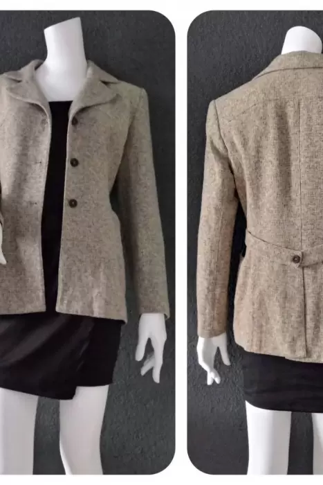 Chaqueta/ Abrigo corto, talla-6 Color beige, corte amplio, con bolsas en los costados yMedio cinturon en la parte de atras.Da a una talla mediana,